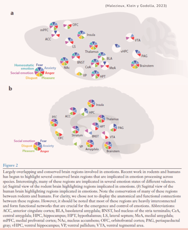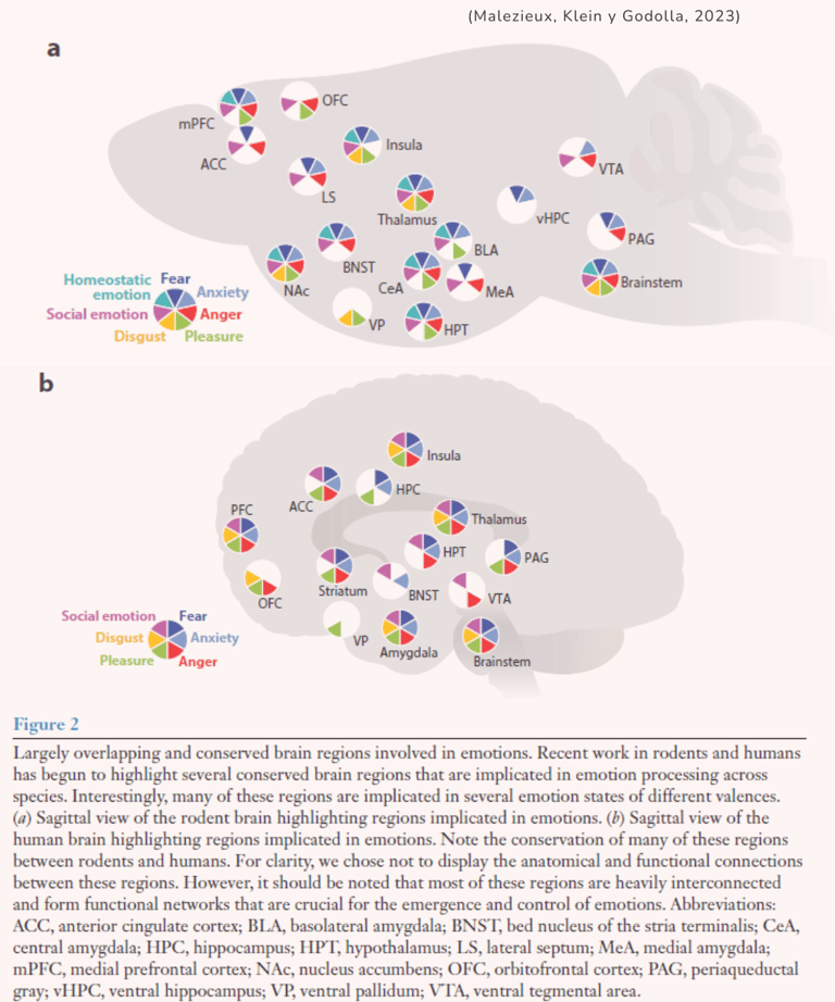 En la neurobiología de la emoción siempre se destaca el sistema límbico, con especial hincapié en la amígdala. Sin embargo, sin restar relevancia a estas estructuras, el procesamiento emocional implica diferentes áreas del cerebro, que están involucradas en diferentes emociones, resaltando la importancia de los circuitos neuronales más que las estructuras en sí, ya que las estructuras aisladas no son suficientes para provocar una respuesta emocional o para inhibirla.