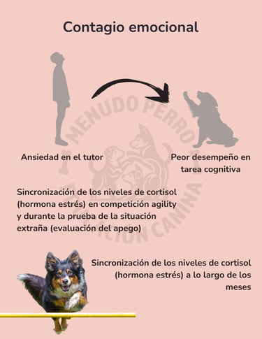 Un aspecto importante en este proceso terapéutico es nuestro propio estado emocional. Los perros son sensibles a nuestro estado emocional y se contagian de él. En tareas en las que miden memoria, el desempeño del perro se ve empobrecido por la ansiedad estado del tutor sin que haya una manipulación directa de su estado por parte de los investigadores (Sümegi y cols, 2014). Buttner y colaboradores (2015) también observaron que los niveles de cortisol durante una prueba de Agility se sincronizaban en la diada guía-perro. La sincronización en los niveles de cortisol entre perros y humanos también se ha observado a largo plazo, es decir, los niveles de cortisol durante meses entre tutor y perro se sincronizan (Sundman y cols, 2019). También durante la prueba de la situación extraña (prueba para valorar el estilo de apego, de la que hablaremos en próximos artículos) se observa esta sincronización (Ryan y cols. 2019). Todos estos datos nos indican la importancia de trabajarnos nosotros mismos cuando empezamos una terapia con perros.
